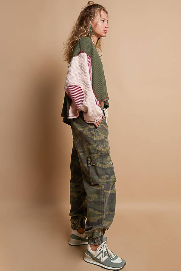 Step into comfort with these camo twill joggers that blend style with practicality. Featuring distinctive box pockets, an adjustable button-and-strap waistband, and a relaxed fit that's perfect for lounging or running errands. With a 29" inseam, 12-1/4" front rise, and 4-1/2" leg opening, they're tailored for an easy, laid-back vibe. Waist measures 14" for a snug, comfortable fit.