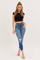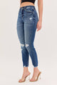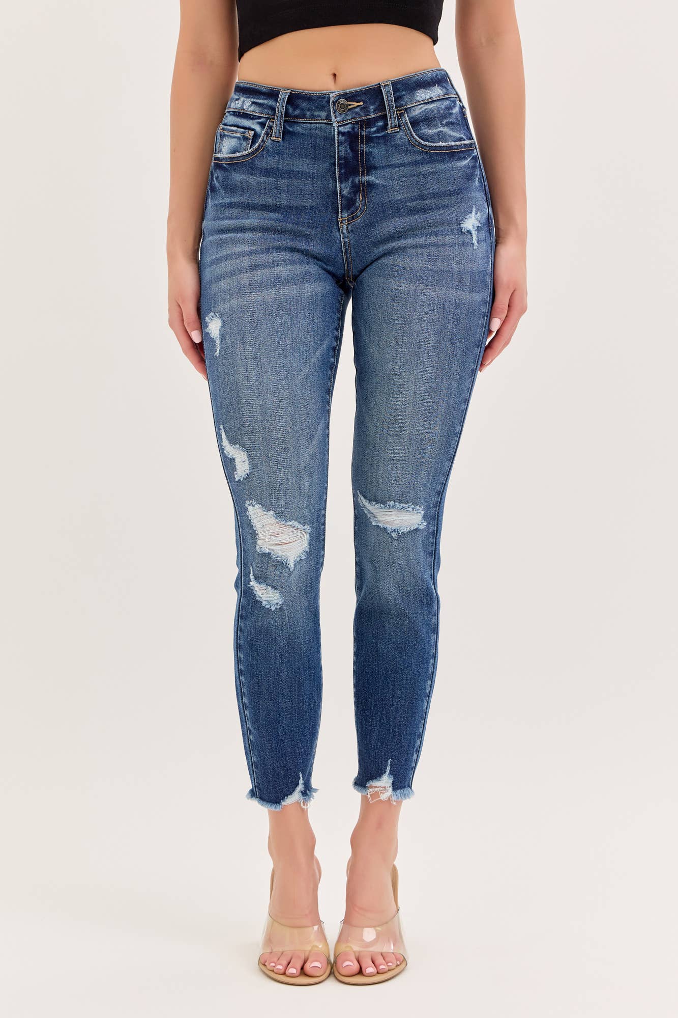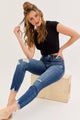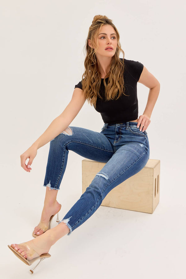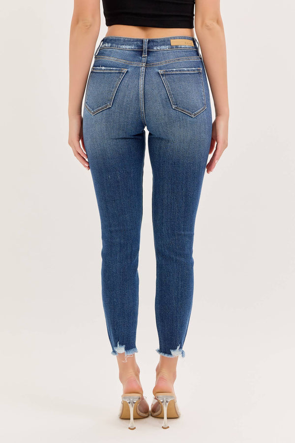 These Ocean Edge Skinny Jeans feature a high-rise fit with five classic pockets and trendy distressing. They zip up easily and come in a rich dark wash with a stylish hem detail. Imported and crafted from a comfy blend of 62% cotton, 33% polyester, 3% rayon, and 2% spandex, they have a 27 1/2" inseam and a 9 1/2" rise—perfect for adding a little edge to your everyday look!