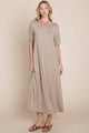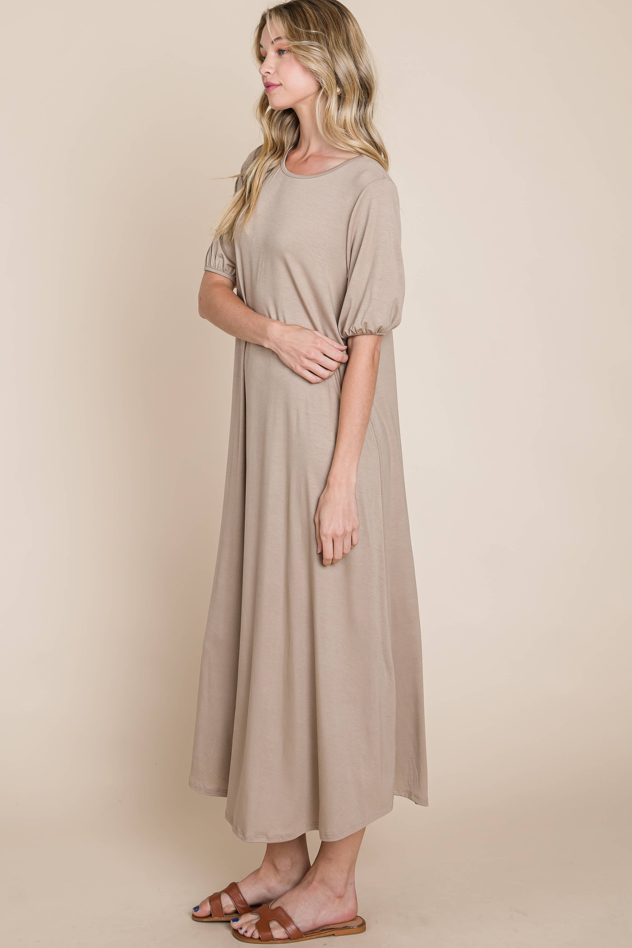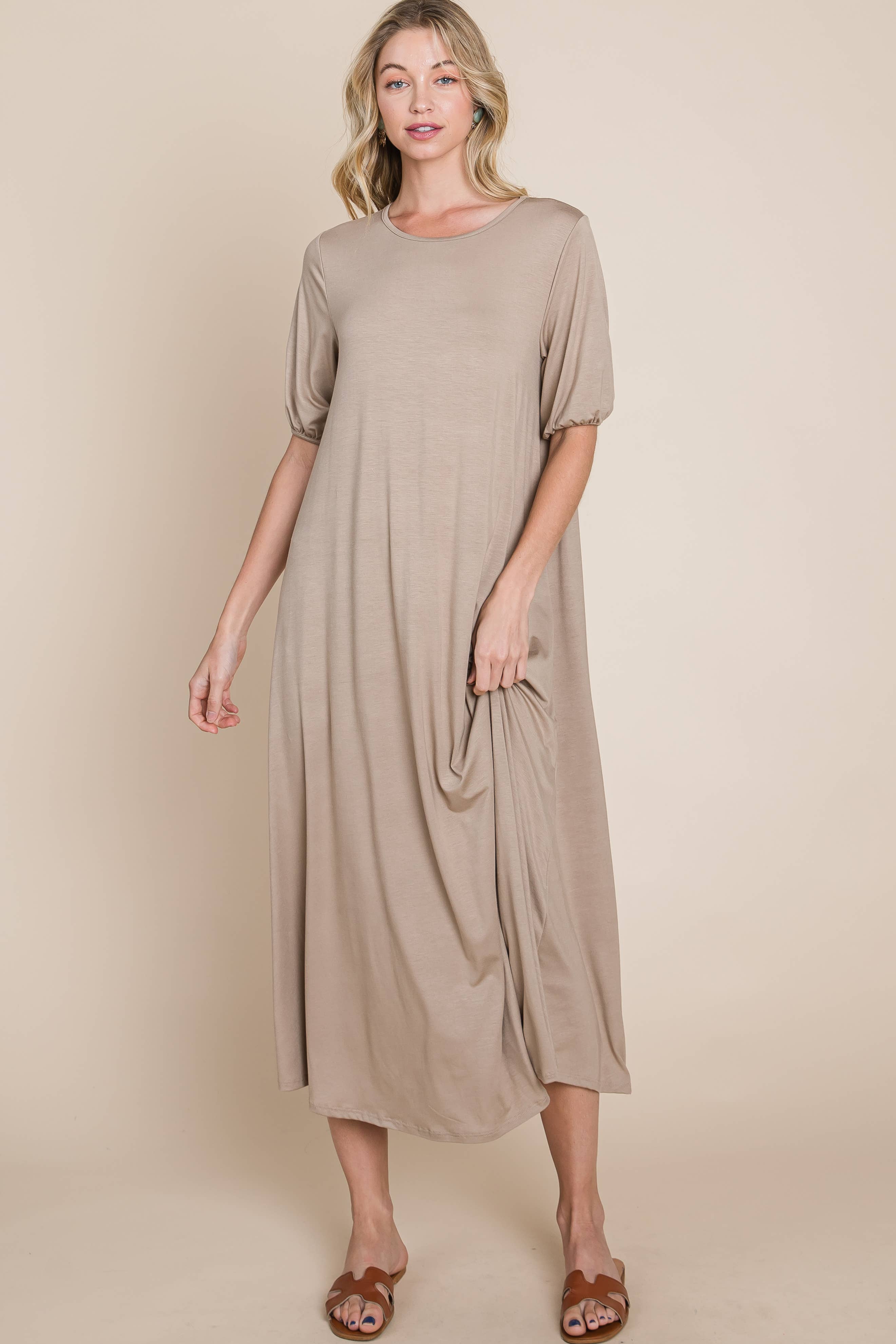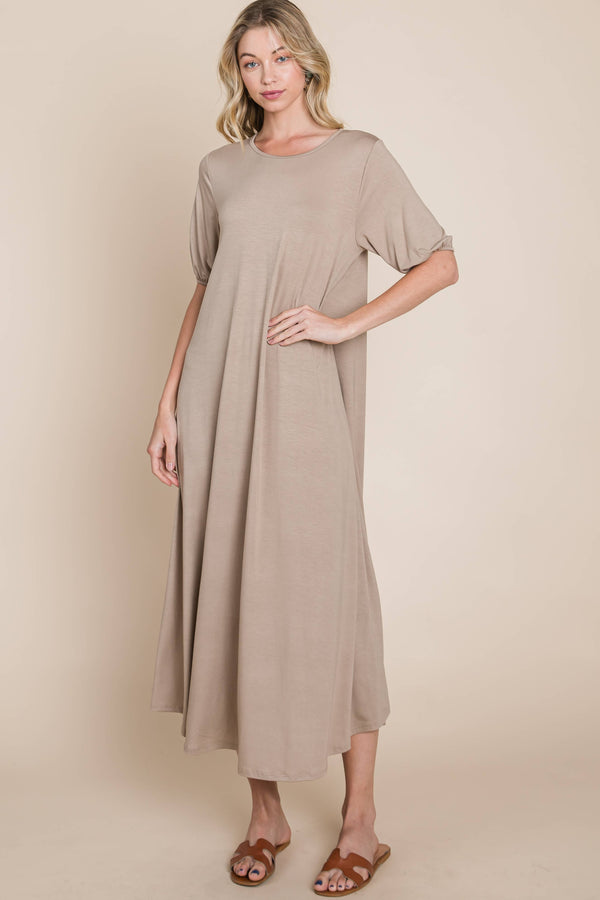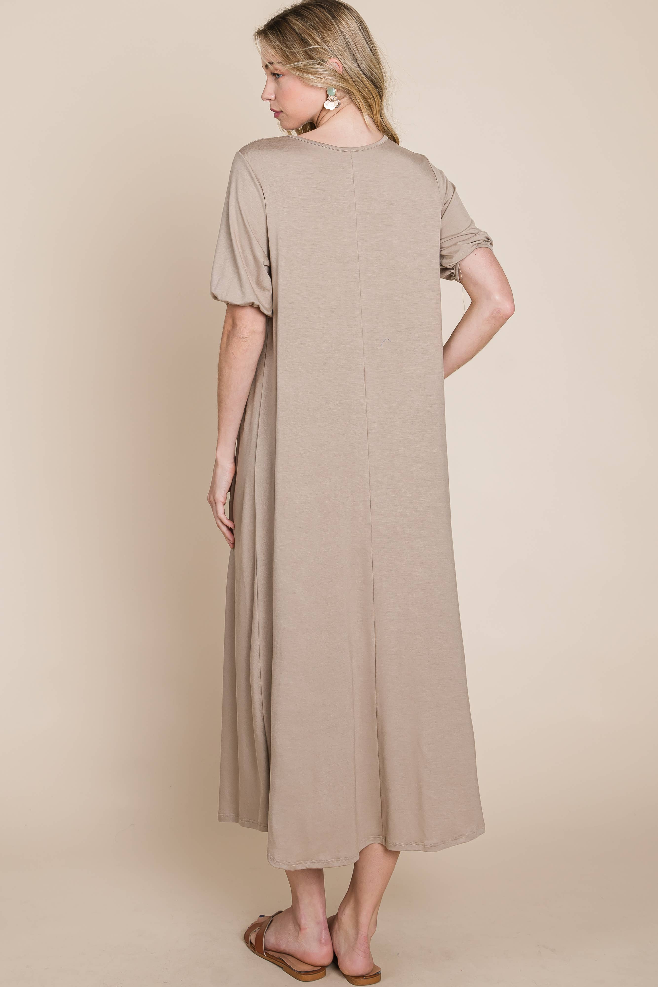 Puff Sleeve Everyday Midi Dress - Taupe / Small is backordered and will ship as soon as it is back in stock.
