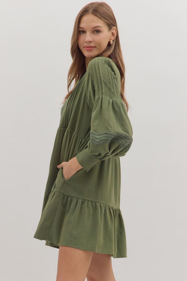 This playful long sleeve mini dress combines delicate lace inserts with pintuck detailing for a charming front look. Lightweight and fully lined, it offers comfort and coverage with non-sheer woven fabric. Enjoy easy button closures at the front and sleeves, plus handy side pockets for a touch of practicality. The ruffle hem adds a flirty finish perfect for any fun occasion.