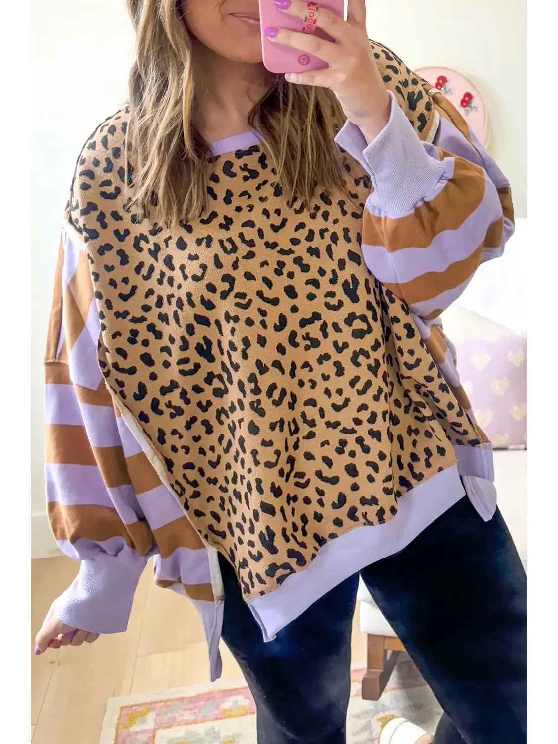 Experience effortless style and comfort with our Autumn Safari Top. Combining a chic design with cozy fabric, this top is perfect for any occasion. The khaki color and leopard/stripe sleeve pattern add a touch of uniqueness to your wardrobe.