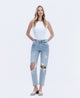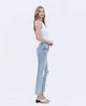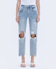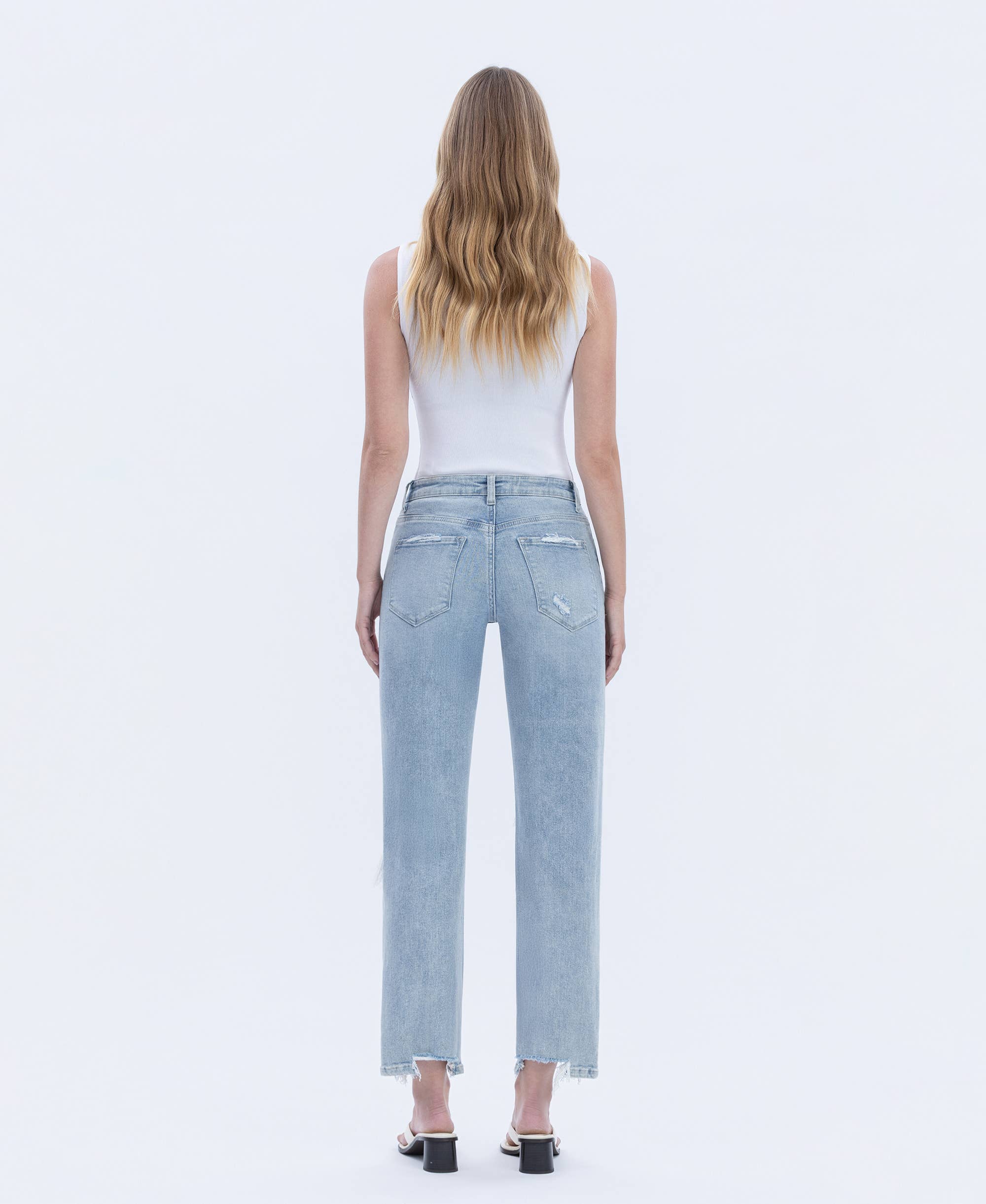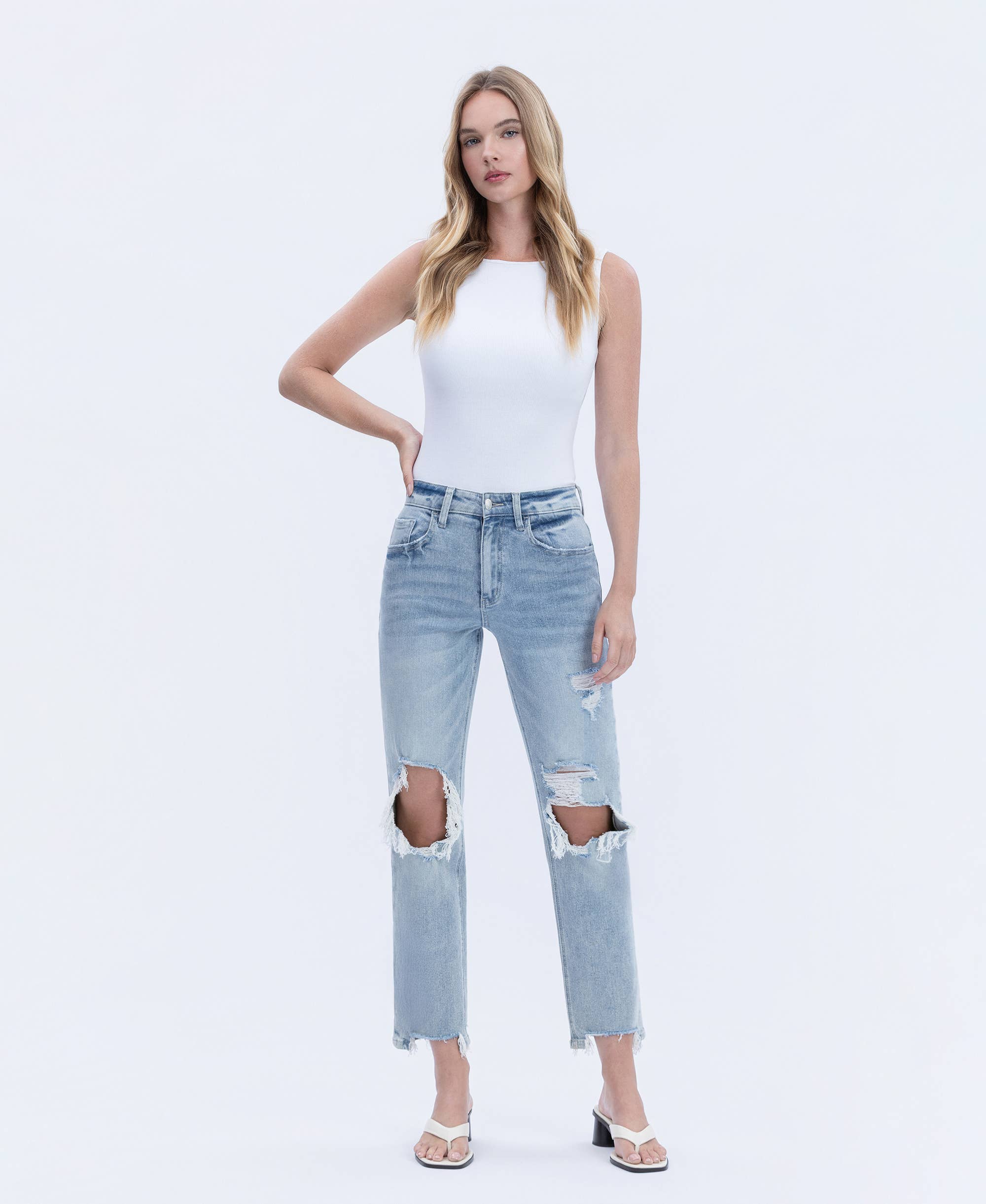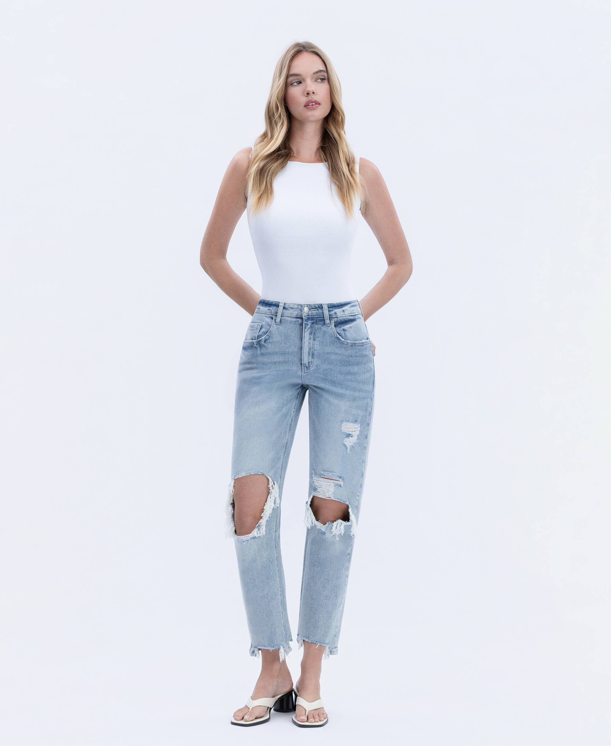 COMFORT STRETCH DENIM, SUPER HIGH RISE WAIST, 5 POCKETS, DISTRESSED DETAIL, ANKLE LENGTH, LIGHT WASH, 90'S DAD JEANS