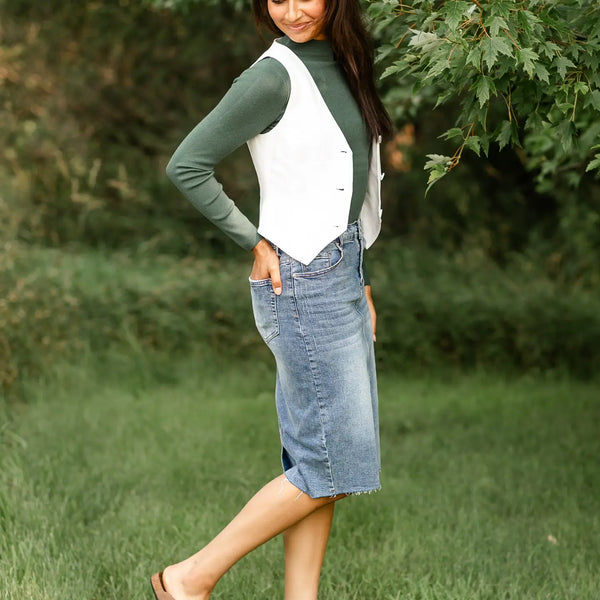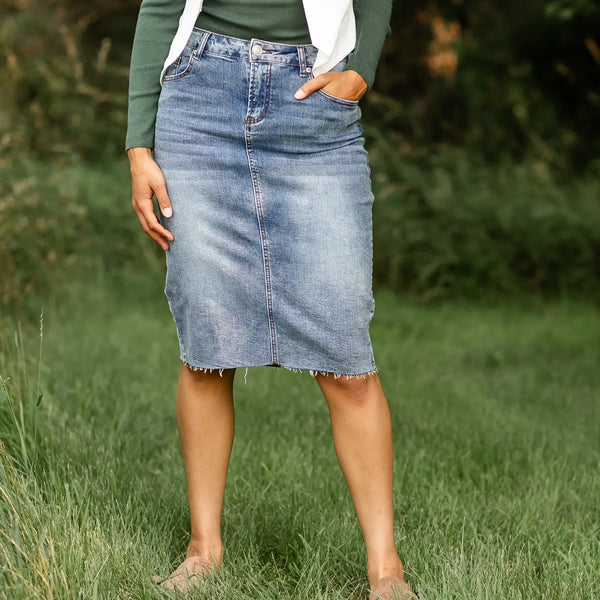 This straight fit skirt is all the things! You're going to love the Inherit Designed Veronica Medium Wash Midi Skirt! This lightweight jean skirt has subtle distressing in a few little spots and classic belt loops. Wear it all year long with any outfit dressed up or down! The raw hem adds a fun detail along with the slight monkey wash on this straight fit skirt! A kick-pleat in the back helps with walkability and you'll love the stretch of this skirt as well!