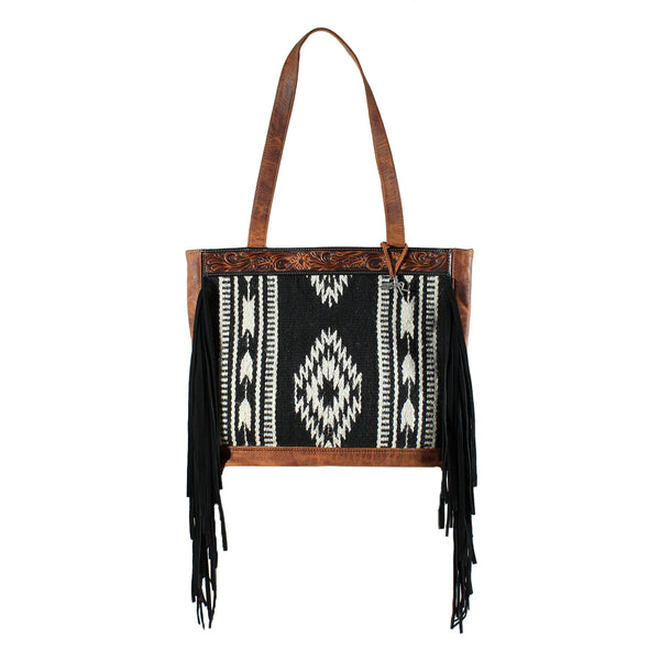 Angel Ranch conceal carry tote by M&F Western Products from the Dixie collection. The body of the bag is a black and white Aztec rug fabric with black fringe on the sides. Back of the purse is leather. Top zip closure to keep all your belongings safe.