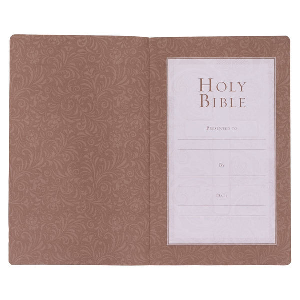 Heat-debossed flourish design, Tan faux leather, Gold-foiled title, Flexcover, Classic King James Version, 1769 Oxford Standardized Revision of the 1611 King James Bible, Full-size Bible, 744 pages, Sprayed edge, Flush cut, Lay-flat Smyth-sewn binding, Double-column format, Thematic Scripture verse finder, One-year Bible reading plan, 8-point type, Presentation page, Packaged in a full-color printed cardboard sleeve, Size: 8.3" x 5.3" x .9" (211 x 135 x 23mm)