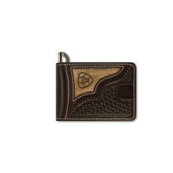 This Ariat rodeo wallet by M&F Western Products is genuine leather. Chocolate leather body with a basket weave embossing and brindle calf hair overlay. Accented with a laser etched Ariat shield. Includes multiple sizes(Rodeo, Trifold, and Bifold Money Clip)
