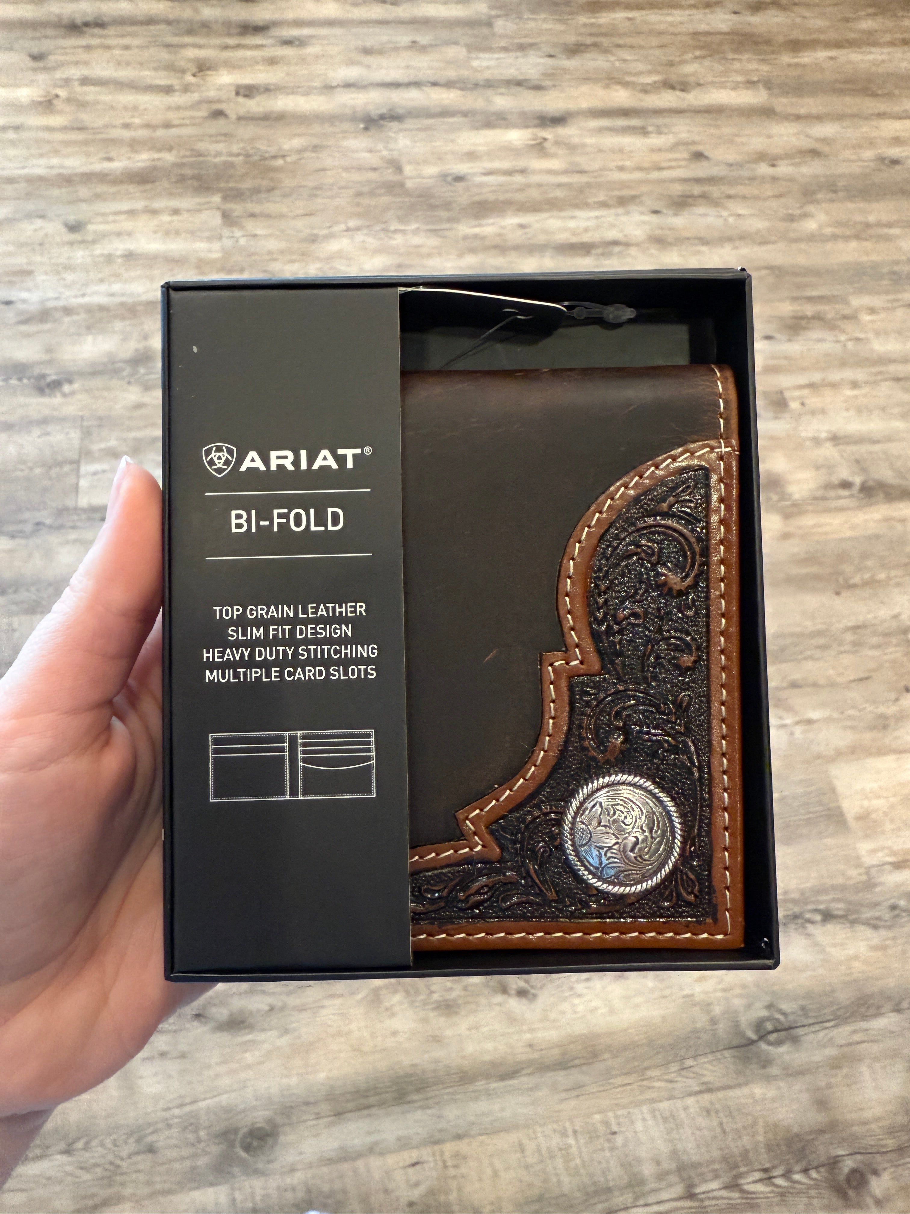 This beautiful Ariat bi-fold wallet by M&F Western Products® features a distressed leather look with an embossed corner overlay. Also has a round silver concho in corner. Inside features multiple compartments for your credit cards, cash, and a place for your ID.