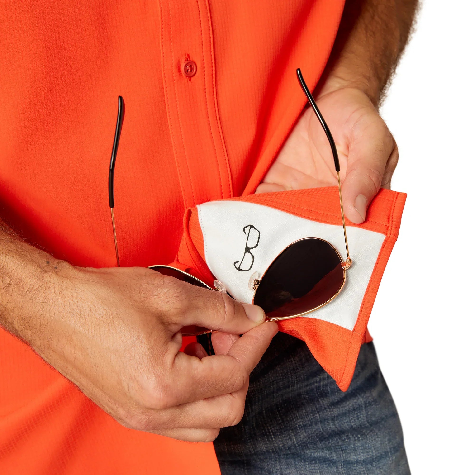 - Microfiber lens cloth is hidden in the hem for on-the-go cleaning