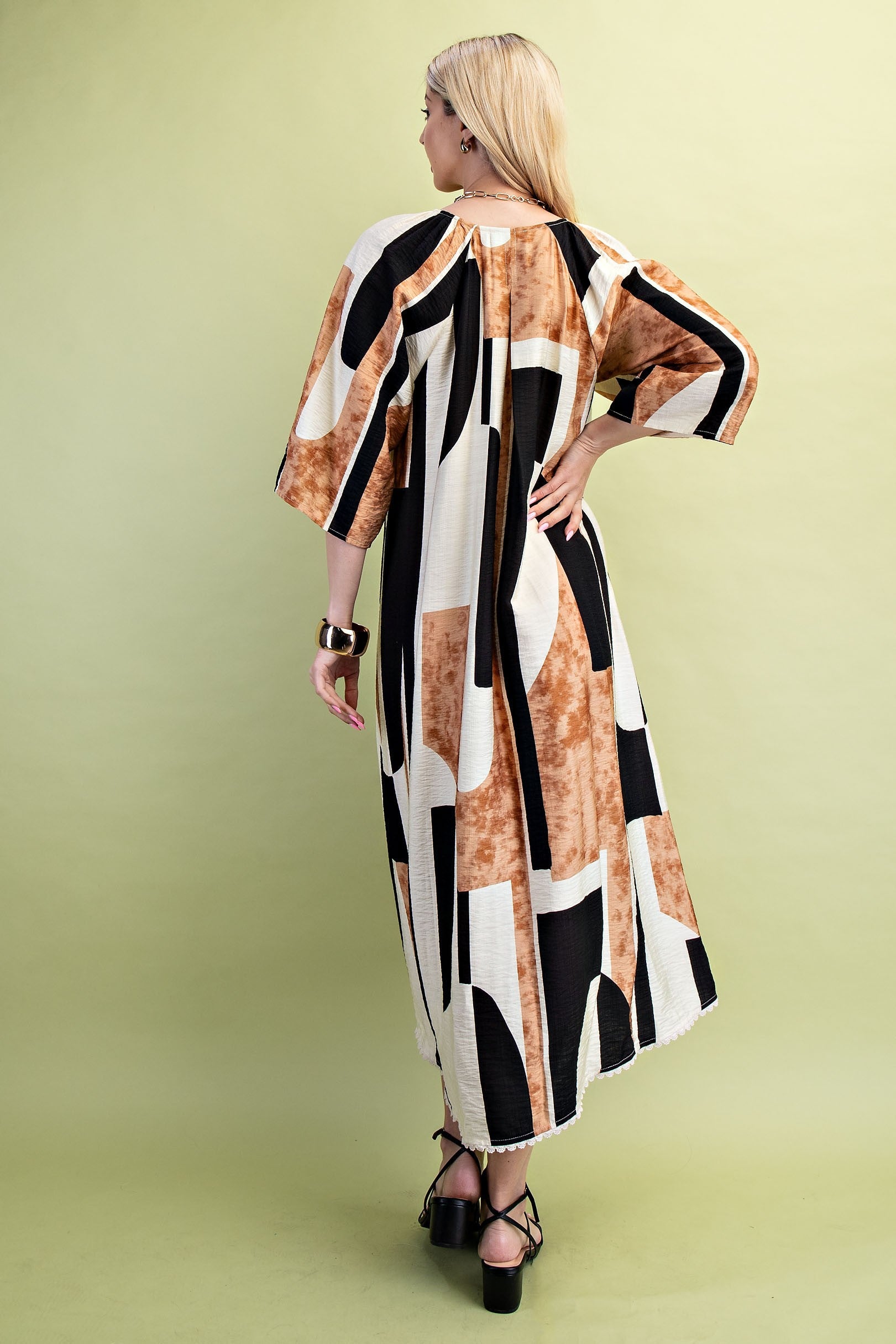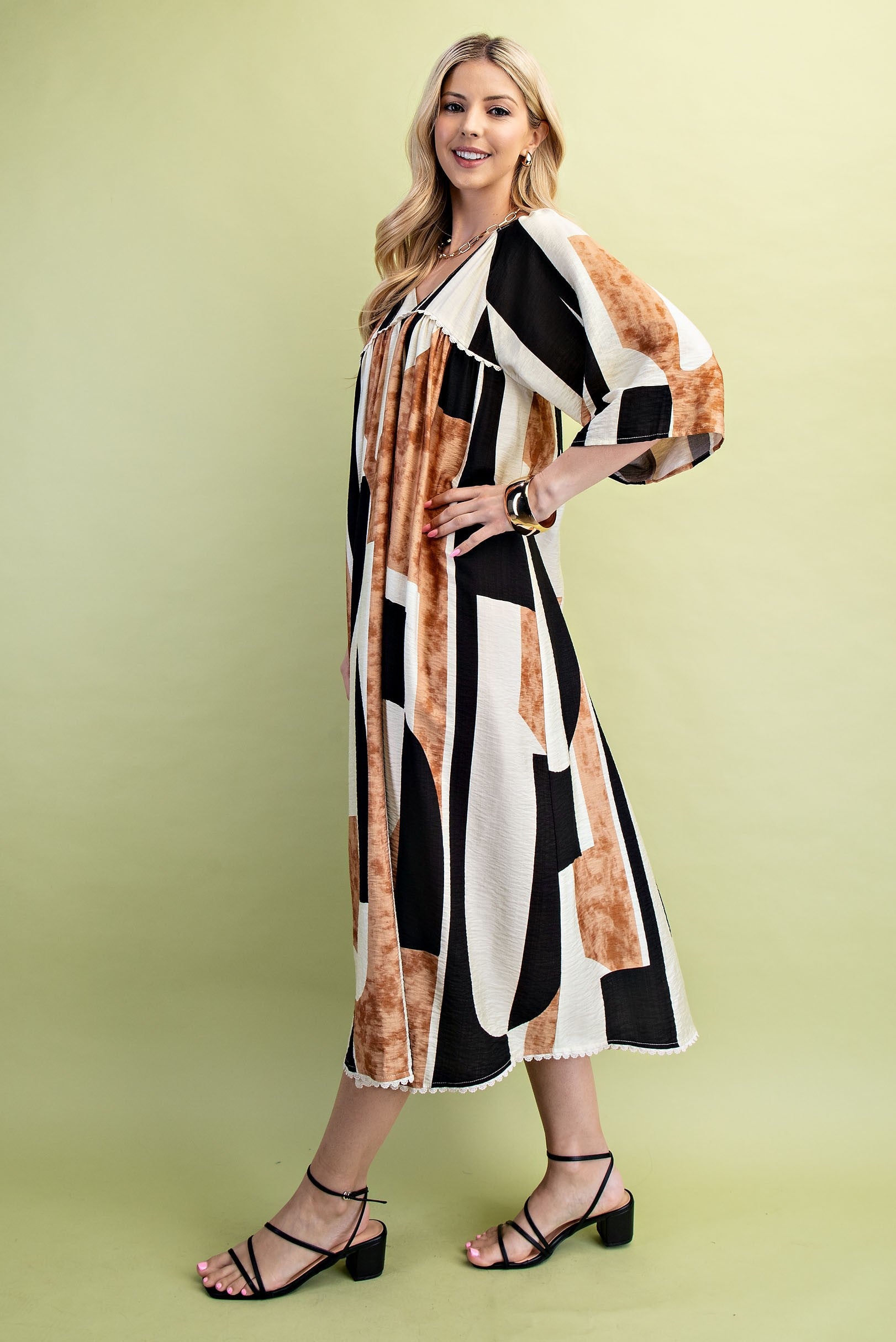 Step into effortless style with the Desert Muse Dress. This playful V-neck midi dress features an eye-catching abstract print that adds a touch of artistic flair to your wardrobe. Its flattering silhouette and comfortable fit make it perfect for day-to-night adventures, whether you’re brunching with friends or exploring new places. Embrace your inner muse and let this dress be the canvas for your next memorable look.