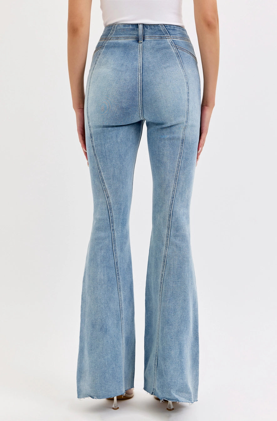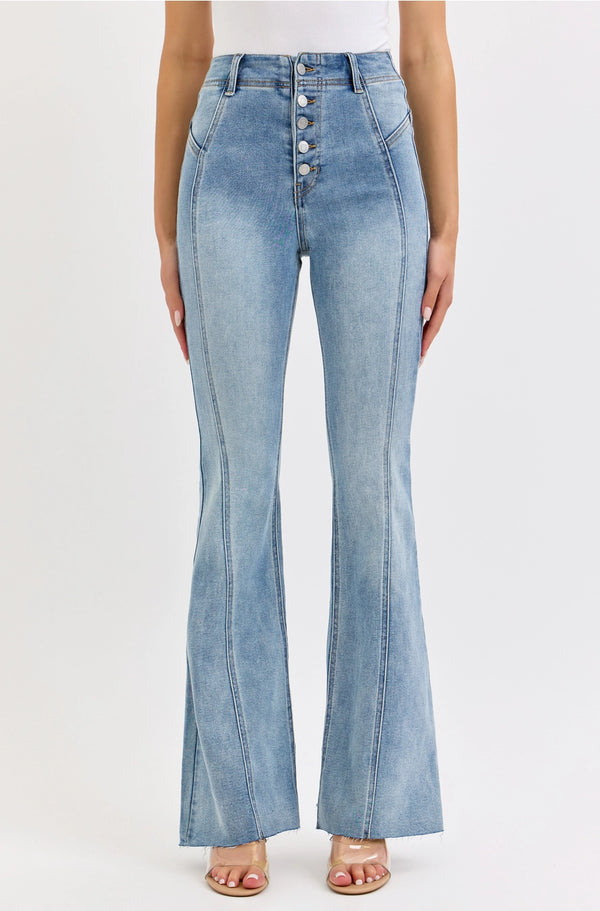 With premium fabric and careful stitched design, we created these dreamy 70’s inspired flares. These jeans are high waisted and fitted made to hug the hips High-rise Flare 5 button-up closure Full length Medium Denim Belt loops Seam Details Import Inseam: 34” Rise: 11 1/2” Fabric Content: 55%Cotton,29%Polyester,13%Rayon,3% spandex