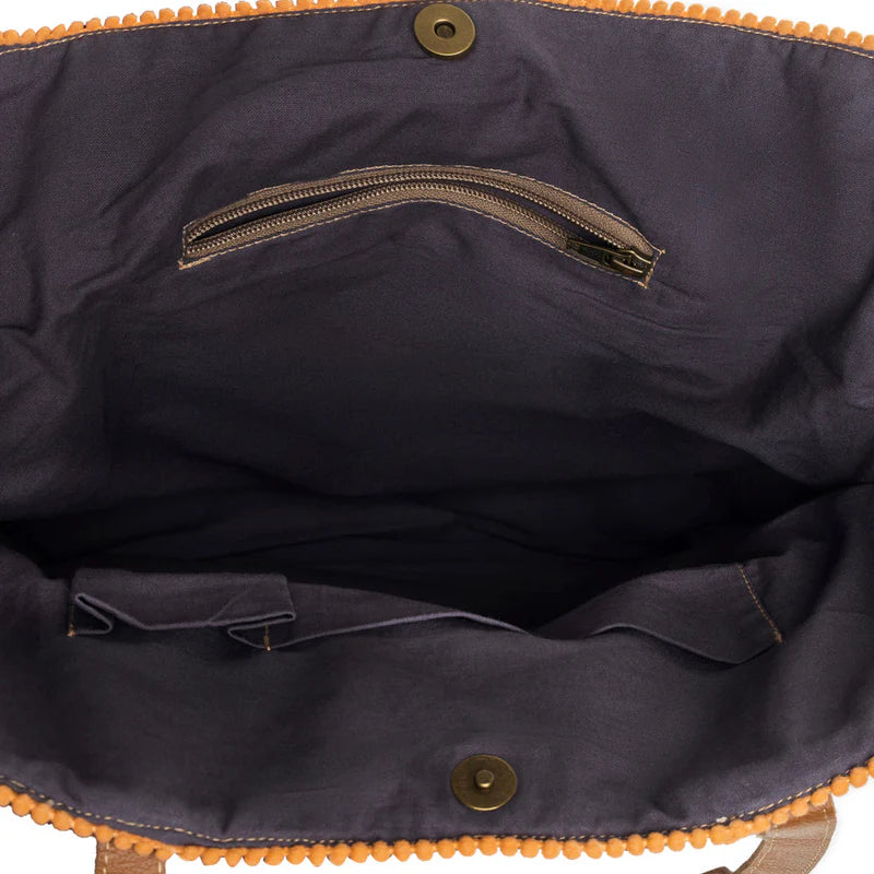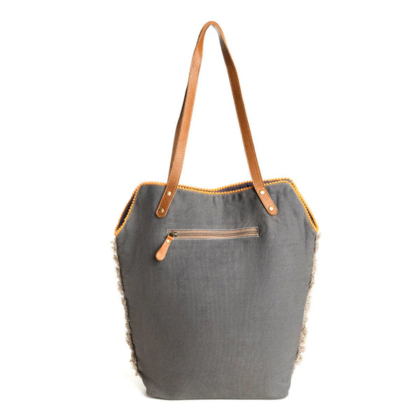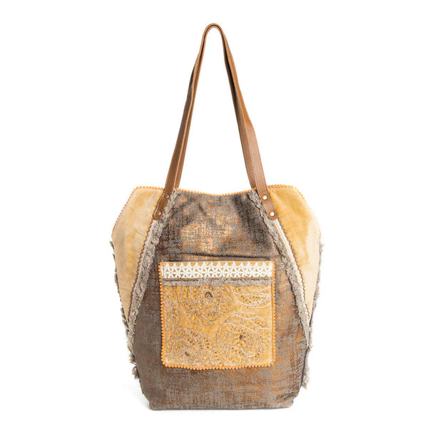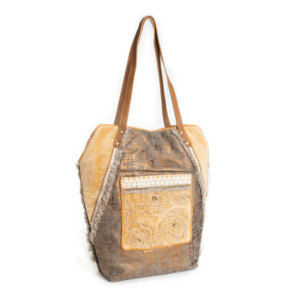 This radiant canvas tote bag in earthy golden yellow and muted bronze hues celebrates Western craftsmanship with its intricate embroidery and soft frayed edges. Perfect for a country-inspired day out or a carnival evening, it blends the rodeo charm with artisanal sophistication, making every adventure unforgettable. Its spacious interior and additional pockets facilitate convenient storage, while the sturdy leather straps provide flexibility of use.