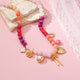 Colorful beaded necklace in gradient shades of pink, purple, and white, featuring gold-tone charms: flower, heart, bow, wishbone, and textured heart. Playful, feminine statement piece with adjustable clasp.