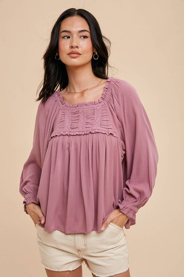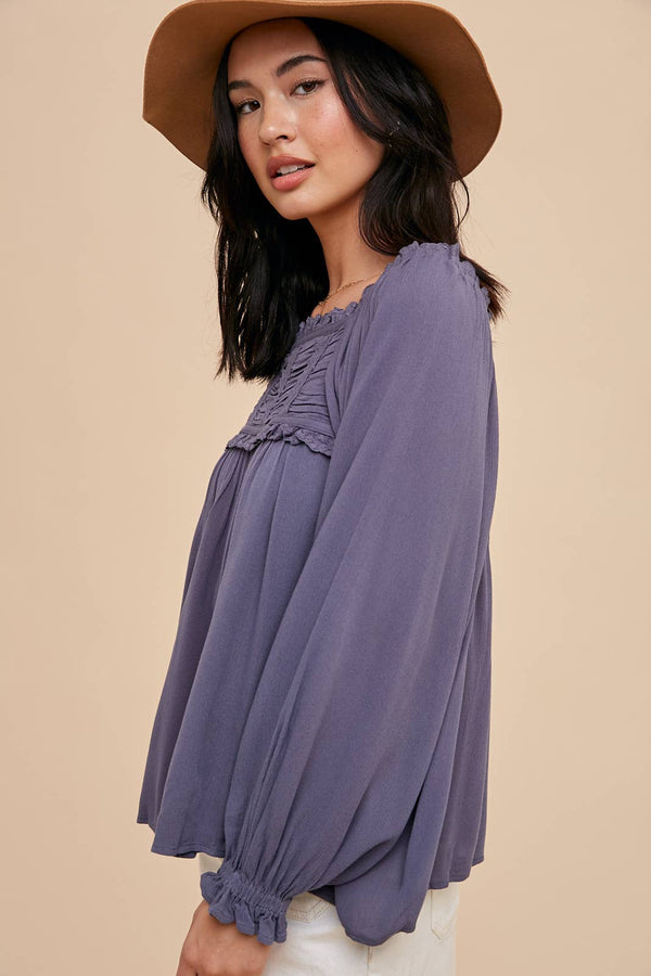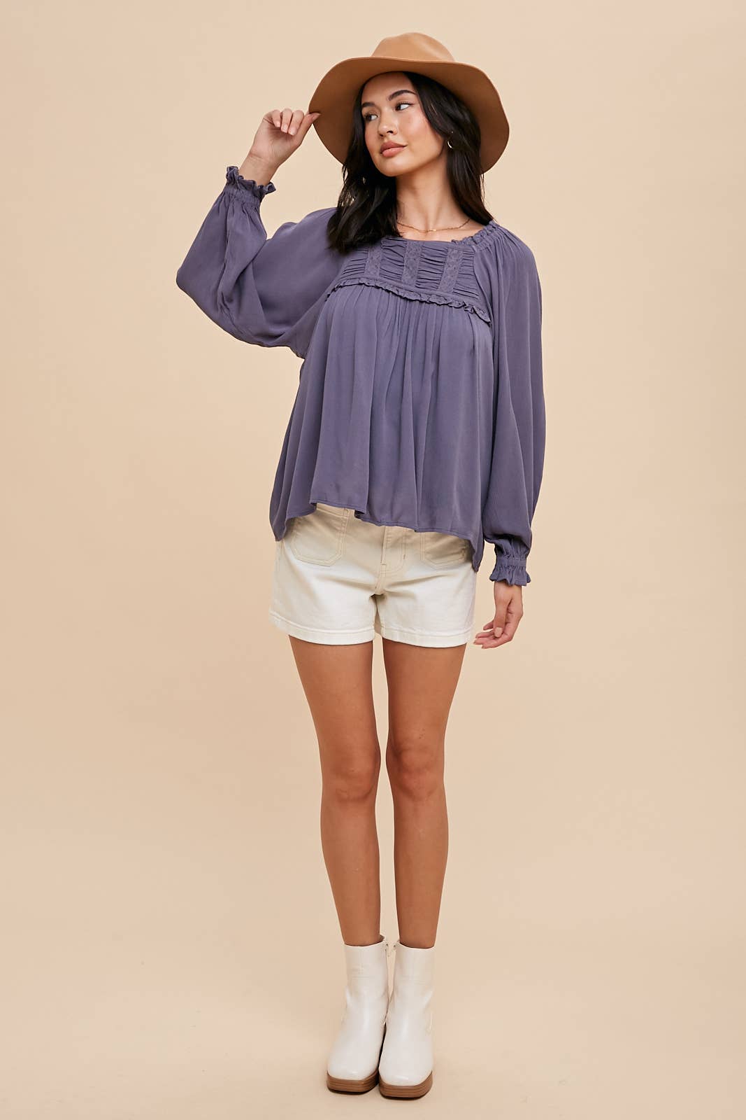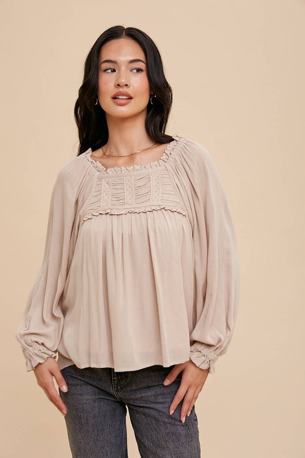 The ruched front blouse is designed with charming lace and playful ruffle details, finished with elastic wrists and a comfortable lining.