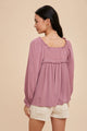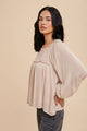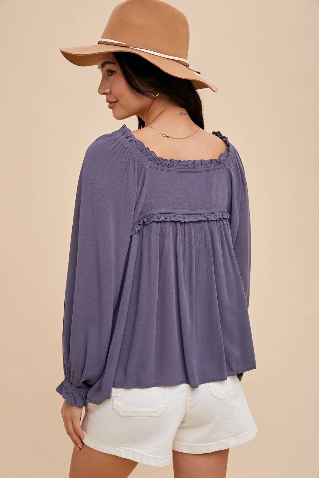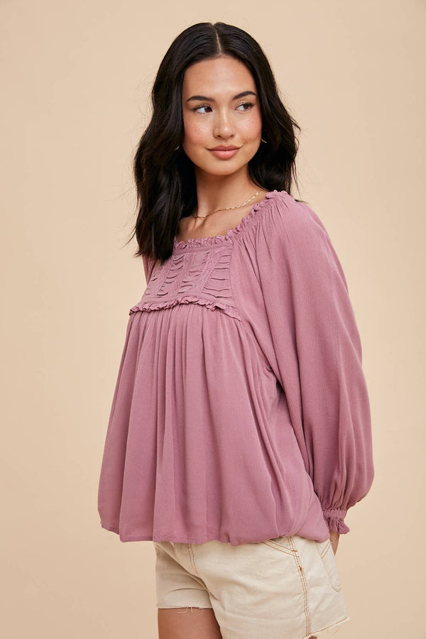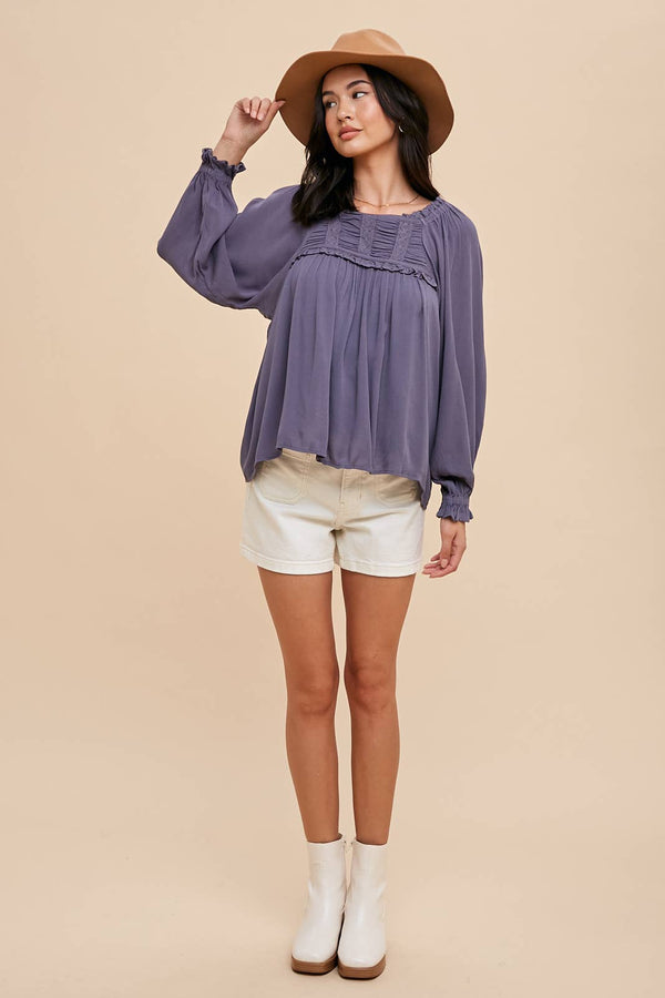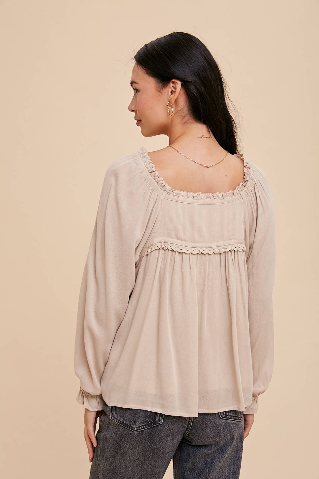 The ruched front blouse is designed with charming lace and playful ruffle details, finished with elastic wrists and a comfortable lining.