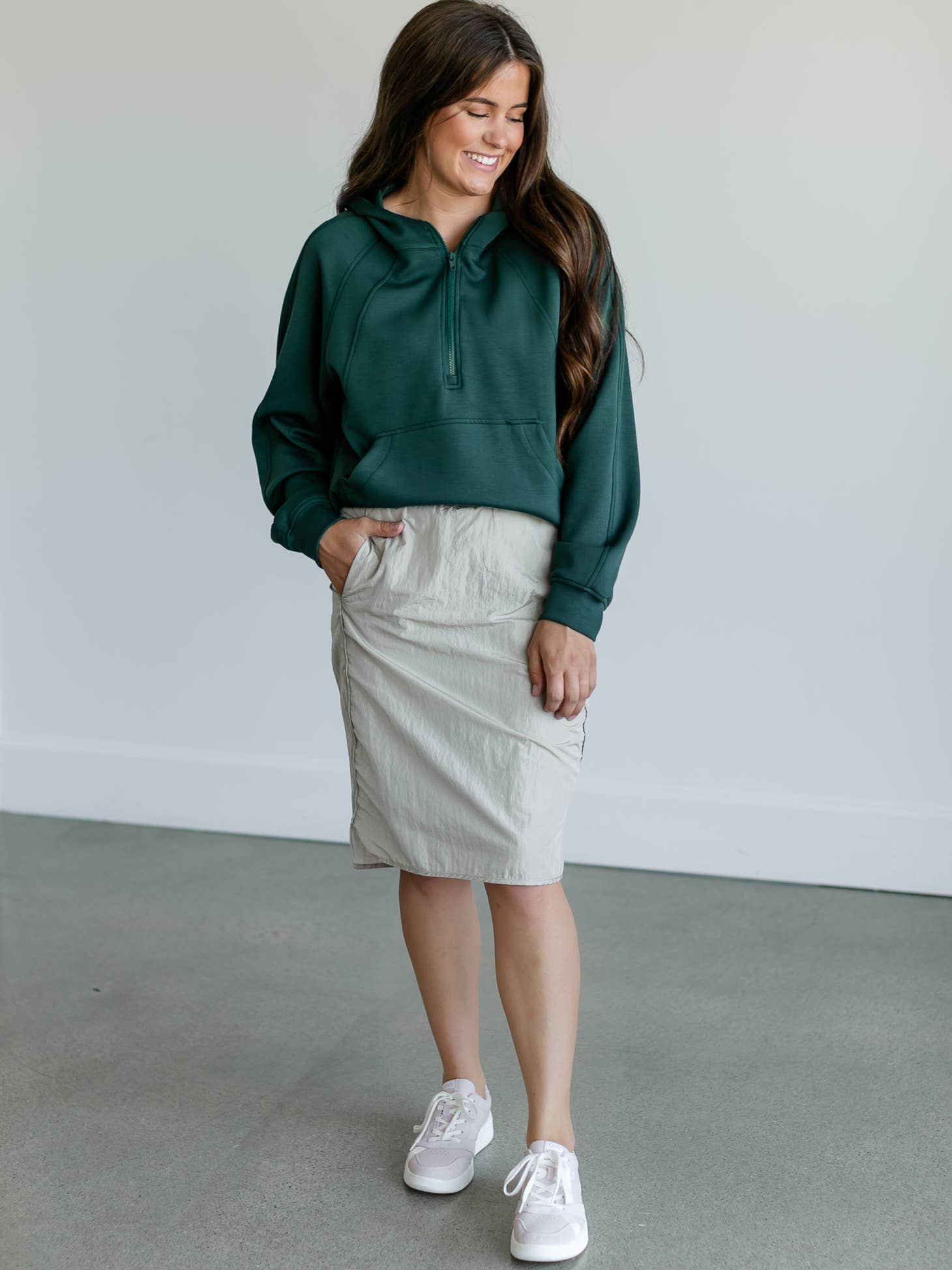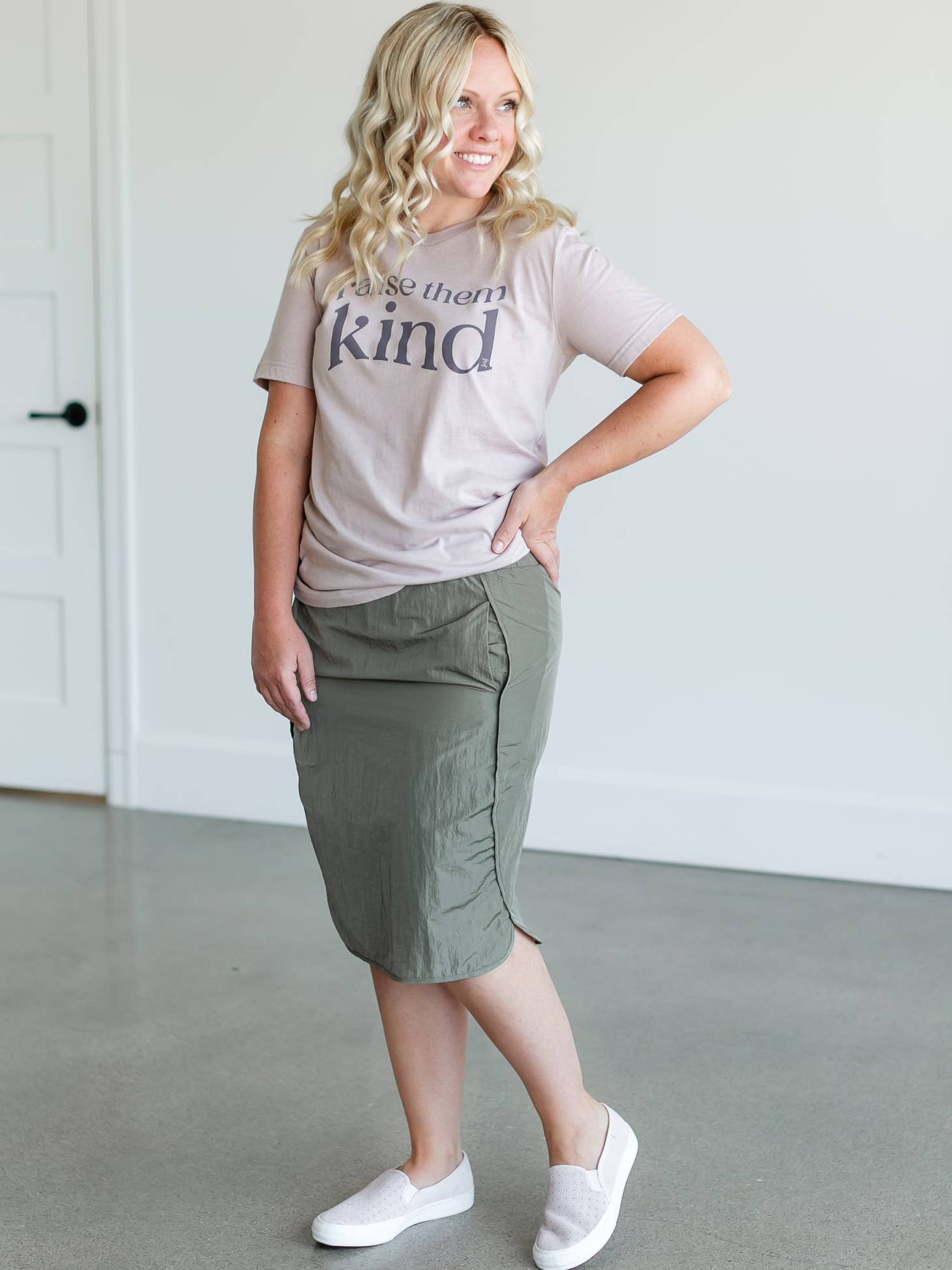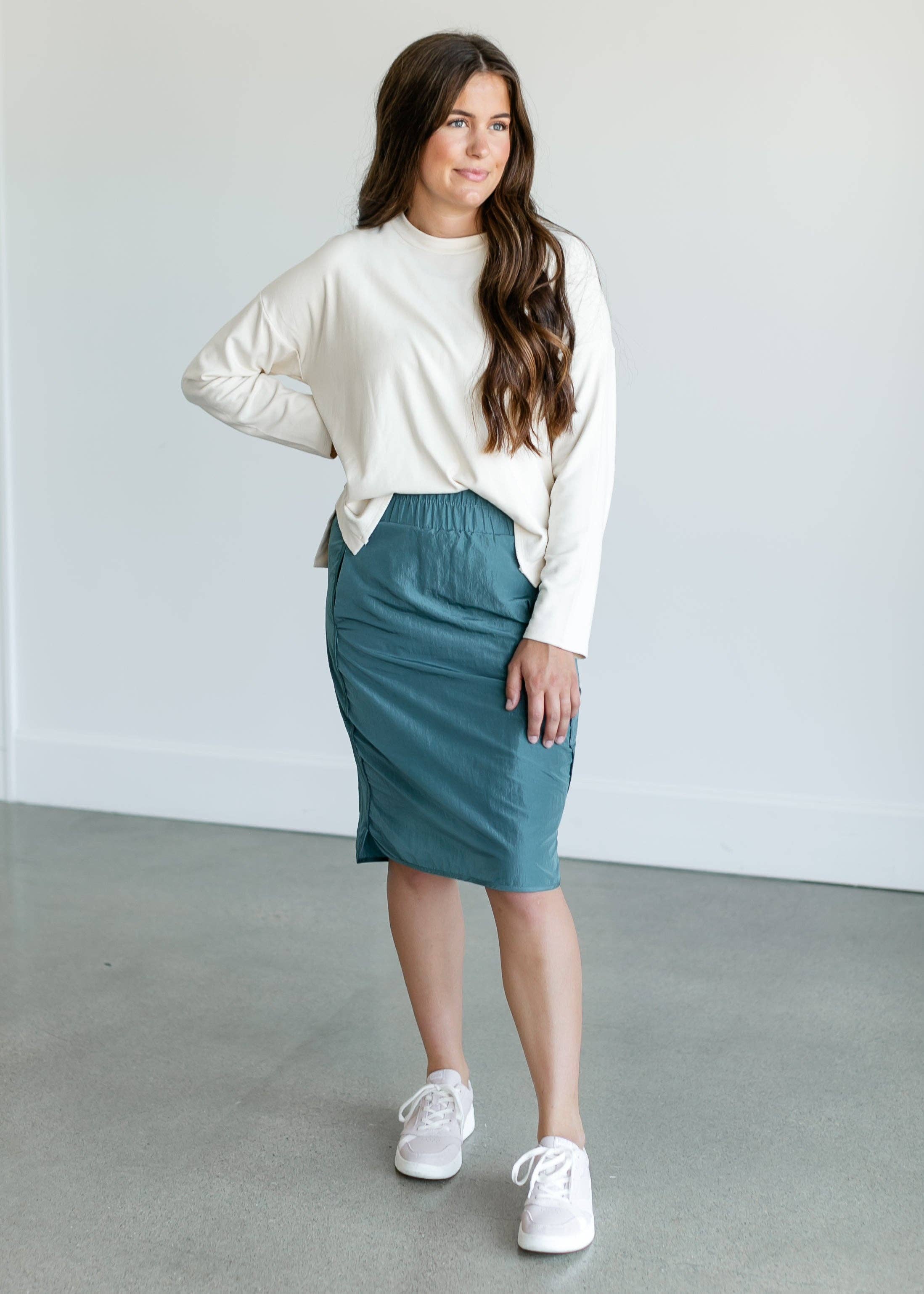 Stay modest and stylish in the Inherit Designed Windy Breaker Midi Skirt. This midi skirt is designed with a wide smocked waistband and high-rise silhouette for a flattering fit. Its split hem allows for great flexibility when engaging in outdoor activities, like walking the dog or hiking. Crafted from breathable fabrics, with built in knee length biker shorts for modest coverage. This skirt is perfect for your next active adventure!